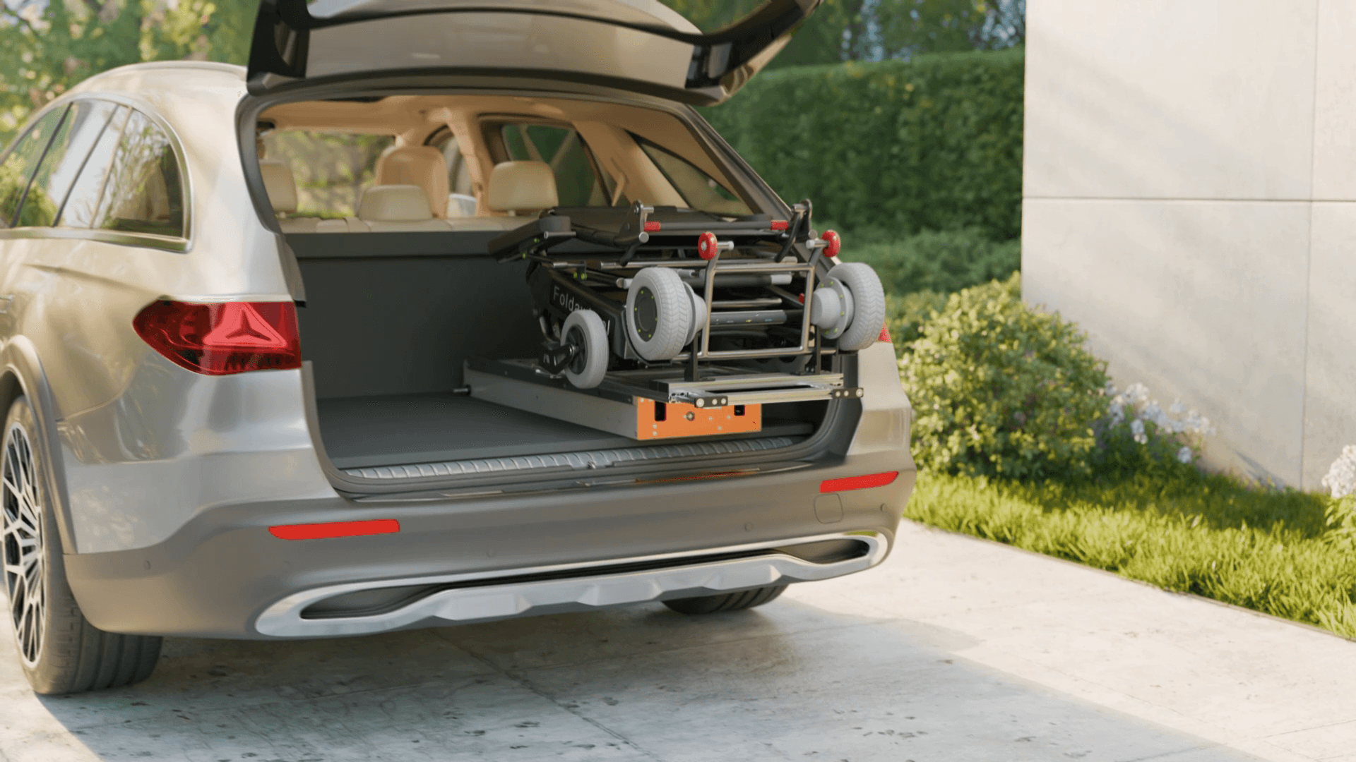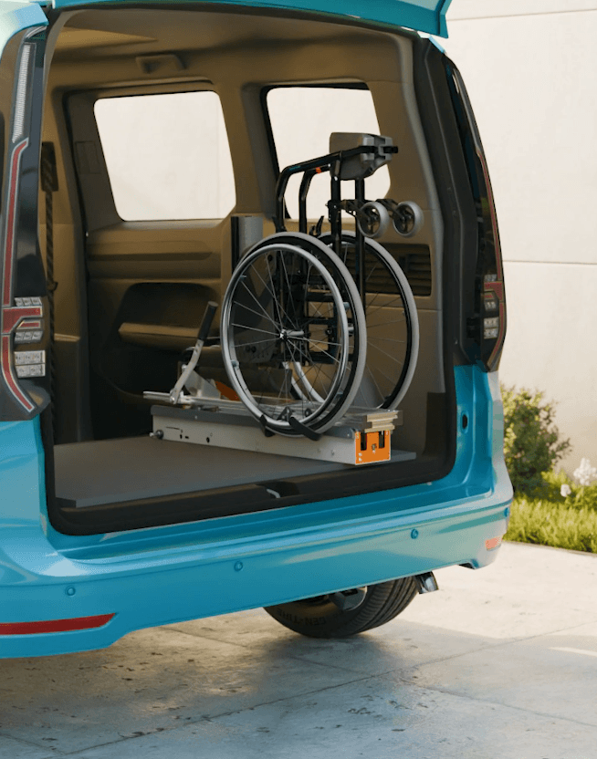 Der Ladeboy verlädt Ihren Rollstuhl ungefaltet in den Kofferraum – bequem per Knopfdruck, ohne Heben, Bücken oder Zusammenklappen. Ideal, wenn Sie noch wenige Schritte bis zum Heck des Fahrzeugs zurücklegen können oder wenn eine Begleitperson den Rollstuhl verladen soll.